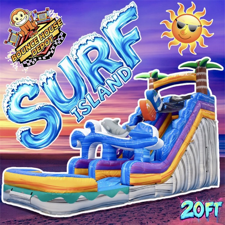 • The Surf Island Slide (Wet or Dry ) 20FTMake a splash with the Surf Island Slide, a striking 20-foot inflatable slide that thrills whether used wet or dry. Tall, smooth, and built for big, safe glides, this slide invites riders to climb a sturdy ladder, whoosh down a wide sliding lane, and land on a cushioned run-out. In wet mode it becomes a refreshing waterslide perfect for hot days and pool less backyards; in dry mode it offers the same fast, fun ride for birthday parties, school events, or backyard gatherings. Bright, beach-inspired styling brings a tropical vibe to any celebration, and the durable construction and reinforced seams are designed for repeated rental use. Easy to set up and supervise, this attraction accommodates a steady flow of guests while keeping safety in mind with high side walls and a soft landing area. Ideal for kids and teens who want excitement without compromise, the Surf Island Slide makes any event feel like a seaside adventure.