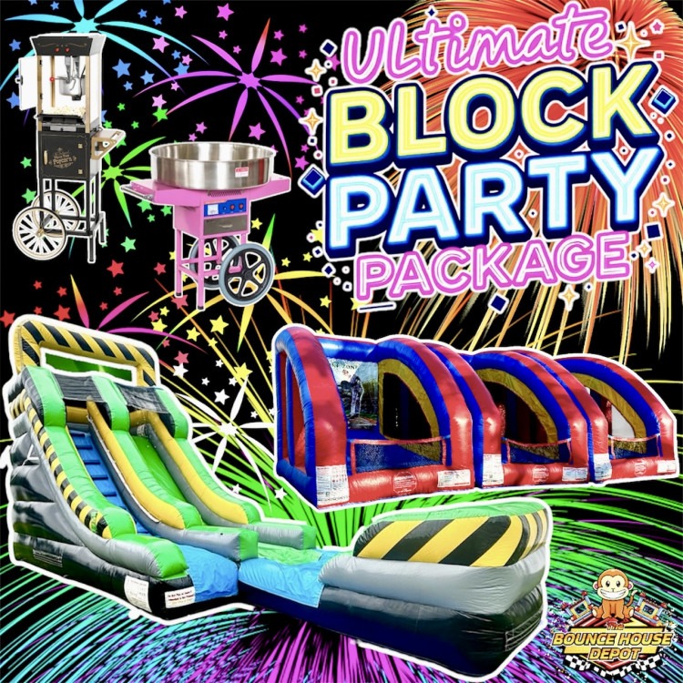 50 Additional servings of popcornThe Ultimate Block Party Package:50 Additional servings of popcorn103021683_2573939_25757910000Keep the popcorn coming with 50 extra servings—pre-measured packs and serving bags that pair with a standard popcorn machine rental. Perfect for bigger crowds, fundraisers, and movie-night marathons. The Toxic Drop Water Slide (Wet or Dry)The Ultimate Block Party Package:The Toxic Drop Water Slide (Wet or Dry)1Dropdown13021683_25625170100The Toxic Drop Water Slide (Wet or Dry) — a bold, high-energy inflatable built to steal the show and cool off a summer event. This dual-lane slide features bright neon greens and yellows set against charcoal accents, a dramatic striped arch, and a cushioned splash / run-out area at the bottom. Riders climb a secure, gravity-defying ladder, choose either lane, and zoom down a steep, fast chute that delivers a thrilling drop and a long, safe finish. Rent it wet to turn the lanes into a slippery water ride that empties into the splash pool, or choose dry for full-speed action without water — ideal for tighter setups, cooler days, or venues that don’t allow water. Designed for easy backyard placement and spectacular party photos, the Toxic Drop is sturdy, visually striking, and made to keep guests of varied ages entertained for hours. Perfect as a stand-alone centerpiece or as an exciting add-on in The Ultimate Block Party Package. - Choose Wet or DryThe Ultimate Block Party Package:Choose Wet or Dry113021683_2562517_25801650011
